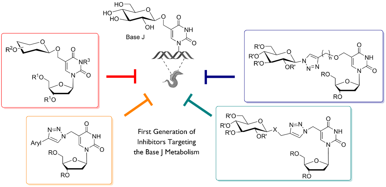 L’un de nos projets vise à développer des sondes chimiques pour étudier les modifications atypiques de l’ADN présentes chez les parasites responsables de maladies tropicales. En particulier, le β-D-glucosyl-5-hydroxyméthyluracile (base J) est une base d’ADN hypermodifiée, essentielle à la survie du parasite et une cible thérapeutique prometteuse. Nous avons mis au point des voies de synthèse pour la base J et ses analogues, dont plusieurs présentent une activité antiparasitaire.