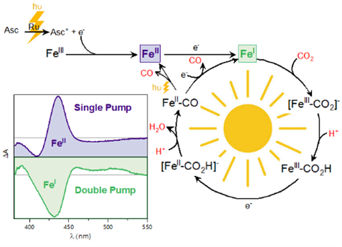 In spite of the advancements in homogeneous catalysis, the development of the next generation of catalysts requires a complete understanding of the fundamental photoinduced processes taking place prior to and after activation of the substrate by the catalyst. In this work, we employ a state-of-the-art nanosecond optical transient absorption spectroscopic setup with a double excitation capability to induce charge accumulation and trigger the reduction of CO2 to carbon monoxide (CO). Our biomimetic system is composed of a urea-modified iron(III) tetraphenylporphyrin (UrFe(III)) catalyst, the prototypical [Ru(bpy)3]2+ (bpy=2,2’-bipyridine) used as a photosensitizer, and sodium ascorbate as an electron donor. Under inert atmosphere, we show that two electrons can be successively accumulated on the catalyst as the fates of the photogenerated UrFe(II) and UrFe(I) reduced species are tracked. In the presence of CO2, the catalytic cycle is kick-started providing further evidence on CO2 activation by the UrFe catalyst in its formal Fe(I) oxidation state.