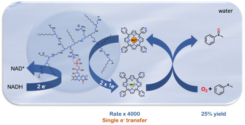 Les métalloenzymes, ou les enzymes d’une façon plus générale, exploitent la structure tridimensionnelle des protéines pour confiner leurs cofacteurs dans un environnement hydrophobe localement polarisé, leur conférant ainsi des réactivités différentes de celle opérant simplement en solution aqueuse. Dans ce contexte, nous développons des catalyseurs supramoléculaires qui reprennent ce principe en incorporant des cofacteurs flavinique au sein d’un polymère hydrosoluble, mais dont le microenvironnement est localement hydrophobe. Cela nous permet notamment de développer des réductases artificielles capables de collecter les électrons de NADH et de les transférer à un centre métallique comme le font les réductases naturelles pour activer le dioxygène, ou encore de catalyser la réaction de Baeyer-Villiger dans l’eau comme le font les Baeyer-Villiger monoxygénases naturelles.