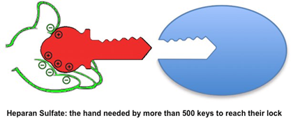 We concentrate on Glycosaminoglycans (GAGs), especially Heparan Sulfate (HS), which are linear and sulfated polysaccharides able to modulate the activities of more than 500 extracellular proteins, including established therapeutic targets. Behaving like a hand needed by Heparan Sulfate Binding Proteins (HSBP) to reach their lock, HS chains are nowadays recognized as crucial additional partners in the « Lock and key » paradigm.