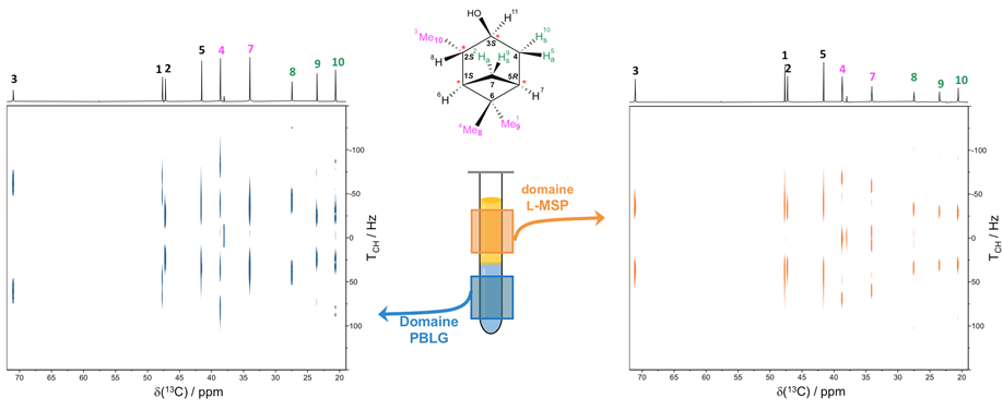 Dans cette sous-thématique sont explorées et développées de nouvelles approches méthodologiques RMN, impliquant l’utilisation de systèmes (chiraux ou pas) isotropes, anisotropes, biphasiques ou bimésophasiques un nouveau concept d’échantillons RMN orientés récemment proposés à l’ICMMO et qui présentent simultanément deux types de domaines orientants après leur démixtion forcée (par centrifugation) ou naturelle (par gravitation).