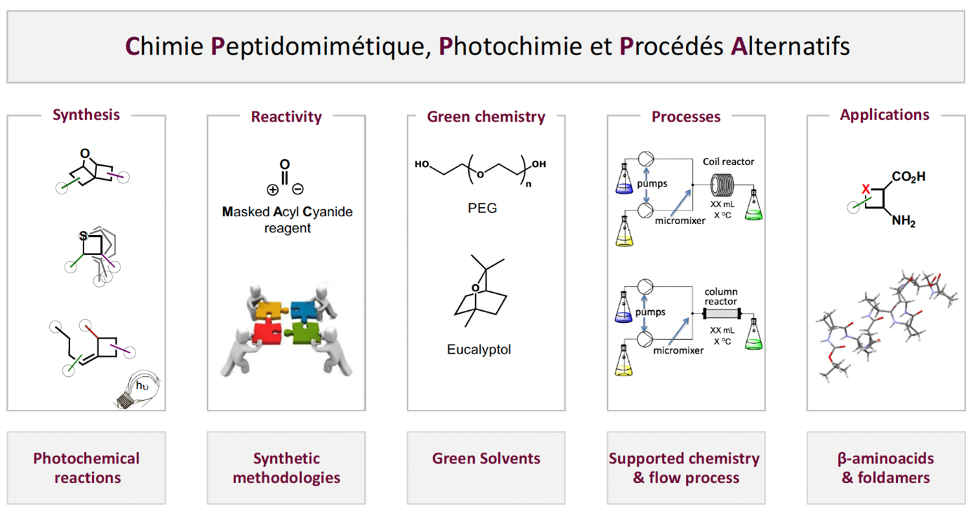 Les activités de recherche de la thématique CP3A concernent le développement de méthodologies et procédés en synthèse organique et leur application à la préparation de composés à haute valeur ajoutée. Les cibles sont des amino-acides non-canoniques, des squelettes moléculaires carbo- et hétéro-cycliques, ainsi que de nouveaux édifices peptidiques dont des foldamères fonctionnels. Parmi les méthodes et techniques utilisées, nous privilégions les approches respectueuses des principes de la chimie verte, notamment en mettant en œuvre de l’organocatalyse, de la photochimie, et de la synthèse en flux continu.